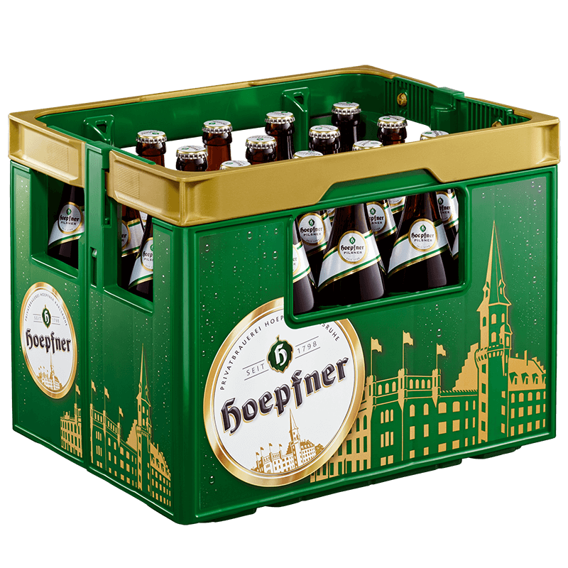 Gönnen Sie sich ein Geschmackserlebnis für Ihren Gaumen: Das himmlisch herbe Hoepfner Pilsner! Gut gekühlt durch die Kehle rinnen lassen und sich beim Genießen in geselliger Atmosphäre angeregt unterhalten – 20 Flaschen mit 0,5 Liter (Glas) – Pfand netto 2,61 Euro