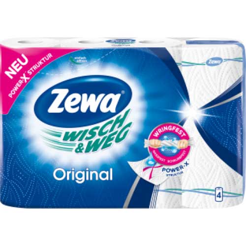 Zewa Wisch&Weg Original Haushaltstücher, die Alleskönner mit innovativer Power-X-Struktur und Marken-Bordüre – 4 Rollen mit 45 Blatt